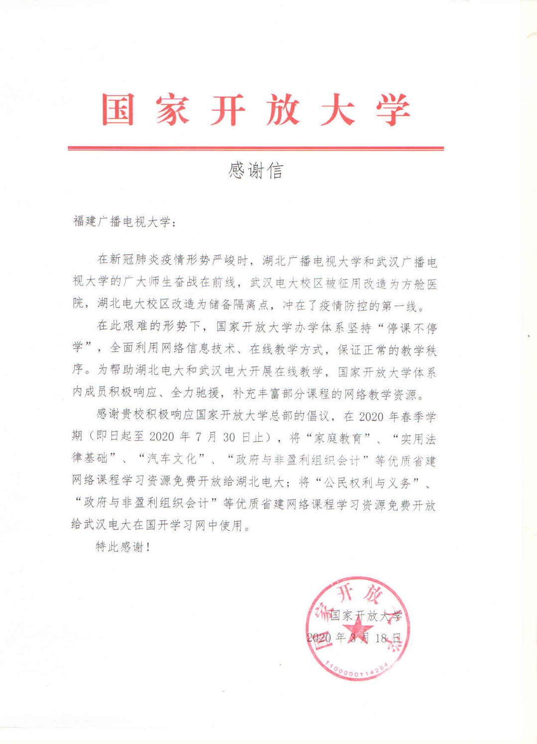 近日,国家开放大学就我校抗疫援助湖北电大、武汉电大的一批优质省建课程资源向学校发来感谢信,来信明确了我校省建课程资源《家庭教育》、《实用法律基础》、《汽车文化》、《政府与非盈利组织会计》、《公民权利与义务》将在2020春季学期通过国开学习网面向湖北电大和武汉电大免费开放共享。