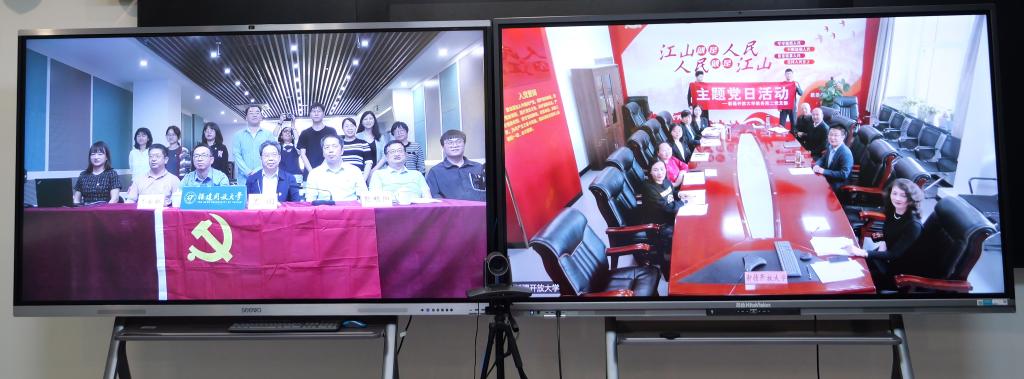 双方支部党员现场交纳了4月份党费,福建开放大学卓晶晶、新疆开放大学刘晓亚还过了政治生日。