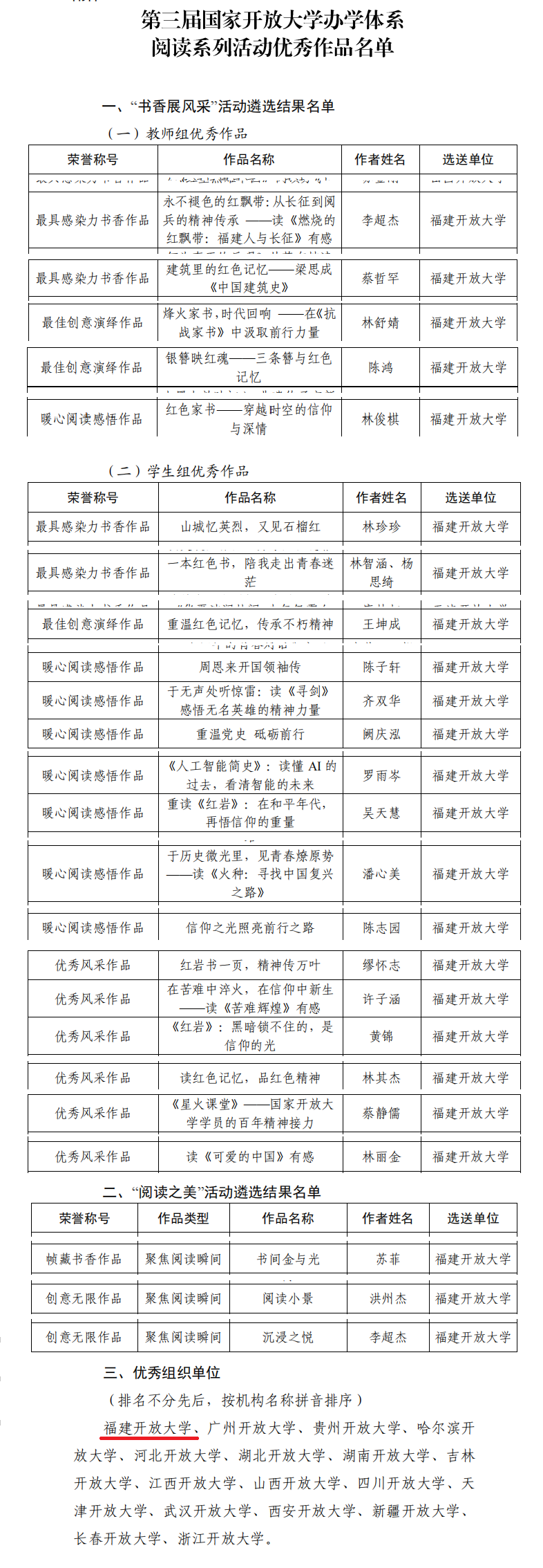 近日,国家开放大学公布了第三届办学体系阅读系列活动优秀作品名单。学校在此次活动中表现优异,荣获“优秀组织奖”,师生作品共斩获24个奖项,充分展现了学校在推动全民阅读、建设学习型社会中的积极作为与丰硕成果。