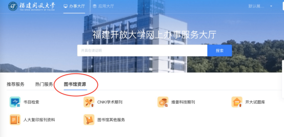 2、 进入智慧校园平台后,在办事服务大厅选择“图书馆资源”,即可访问图书馆电子文献资源,如下图:
