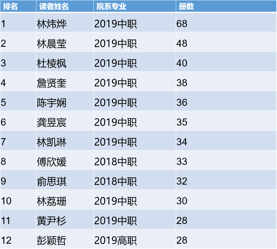 书籍是承载人类文明、民族精神的重要载体。阅读是人类获取新知、拓宽眼界的重要方式。回首匆匆而过的2019年,许许多多同学,走进图书馆,与书为友。经图书馆统计,林炜烨、林晨莹、杜棱枫等12位同学借阅量较大。为鼓励这些热爱阅读的同学,特授予他们“2019-2020学年‘阅读之星’”称号(具体情况见附件表格)。