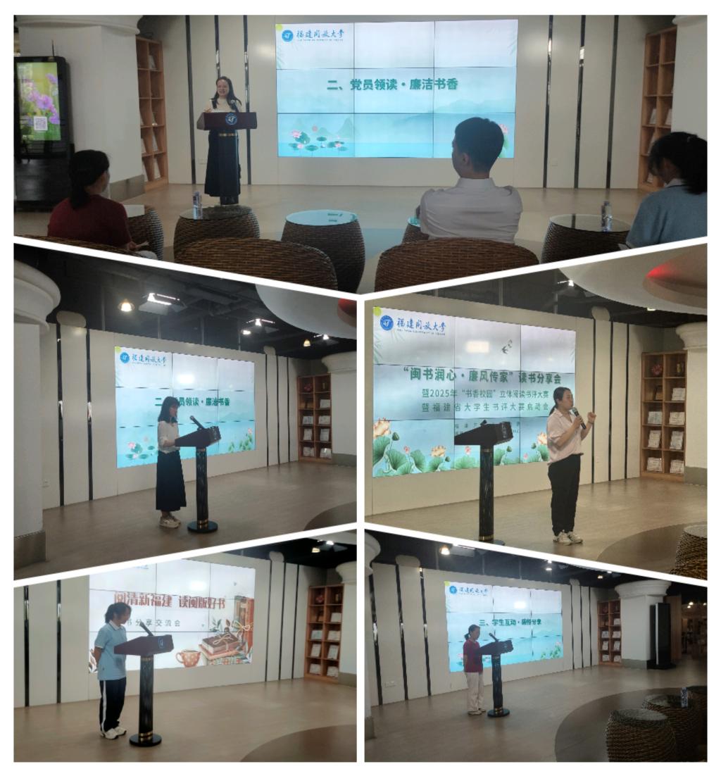 党员领读树榜样,廉洁书香润校园。在“党员领读・廉洁书香”环节,教师代表结合谷文昌、廖俊波等党员楷模事迹,讲述“扎根基层、心系群众”的奋斗精神与“立德树人”的教育使命。学生代表围绕“闽版书中的廉洁元素”展开讨论,一致表示将汲取典籍力量,让廉洁成为青春底色。